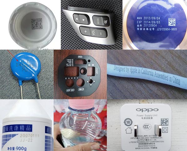 像现在的灯具、手机充电器以及其它配件、鼠标、透光键盘及各种电子元配件上标刻日期、参数、商标等。