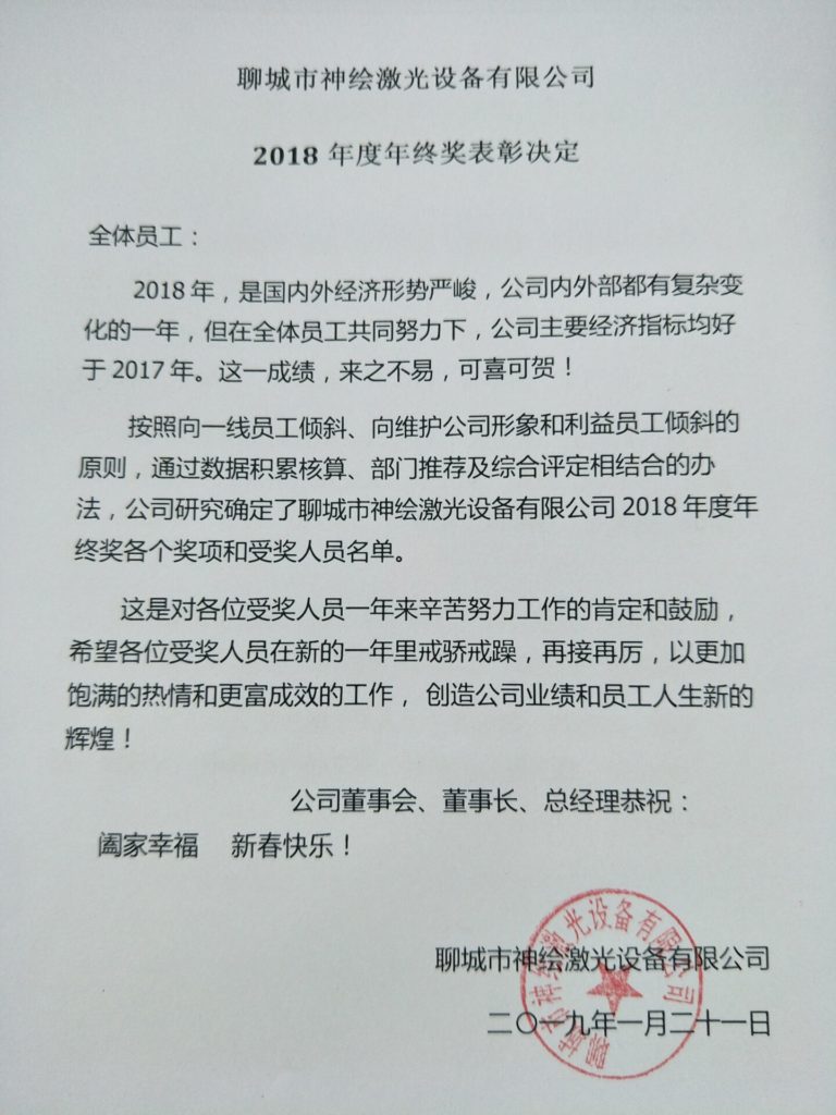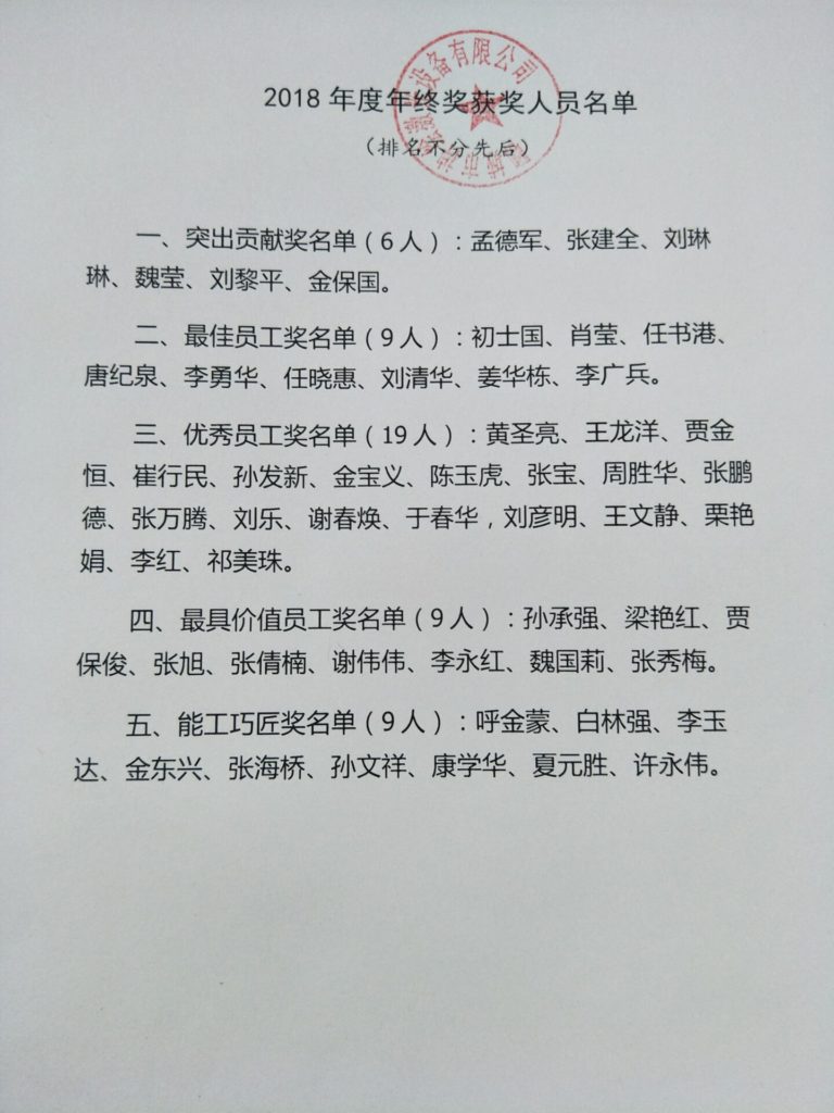 三、优秀员工奖名单(19人):黄圣亮、王龙洋、贾金恒、崔行民、孙发新、金宝义、陈玉虎、张宝、周胜华、张鹏德、张万腾、刘乐、谢春焕、于春华、刘彦明、王文静、栗艳娟、李红、祁美珠。