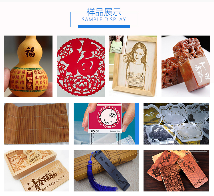 (2)适用于小面积的工艺品加工,在双色板、木板、竹片、有机玻璃、布匹上刻各种各样的图形和文字,图文并茂,形象逼真。