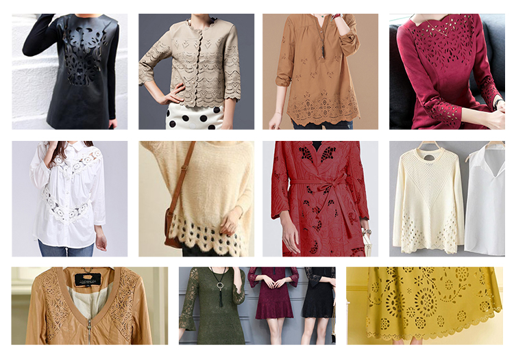 服装激光镂空是由激光器所发出的水平激光束经45°全反射镜变为垂直向下的激光束,后经透镜聚焦,在焦点处聚成一极小的光斑。光斑照射在服装布料上时,使材料很快被加热至汽化温度,蒸发形成孔洞。随着光束对服装布料的移动,使孔洞连续形成宽度很窄的(如0.1mm左右)切缝,完成对服装布料的切割,形成自己想要的图案或文字。