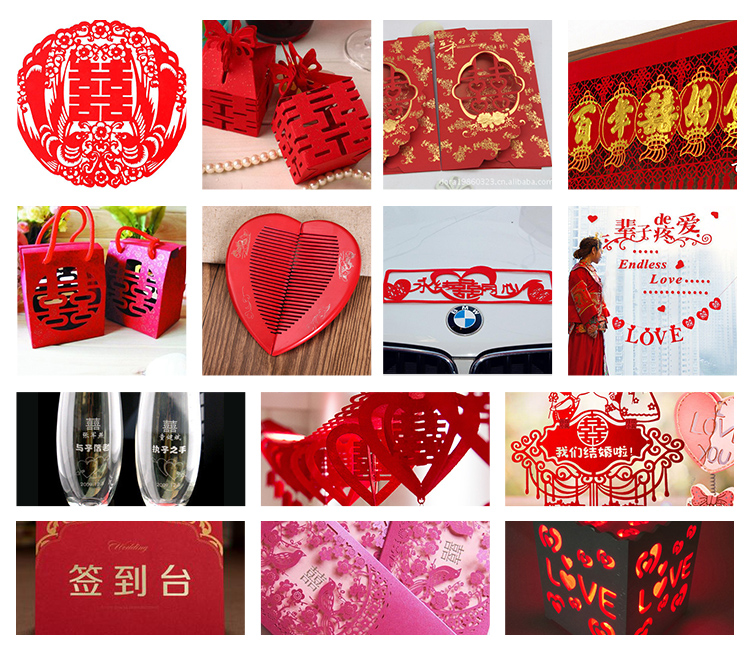 激光雕刻的婚庆用品包括:毛毡拉花、纸质拉花、绒布刻字、竹木喜梳、纸质喜帖/剪纸、纸质喜糖盒、纸质桌卡、刻字玻璃杯、亚克力/PVC灯罩等。