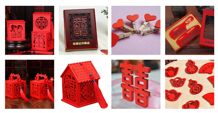 木制婚庆用品因其古朴厚重的质感,经常被应用于各类婚庆用品的外包装,例如:喜糖盒、红酒盒、装饰挂件、摆件、木制喜字等。婚庆木制品往往做工精细、用料考究、拥有精美的外观及造型,因此木制婚庆品其本身也通常具有极强的观赏性和商品性。由于选材、做工以及配件的考究,也使得婚庆用品的价格高于其他材质。
