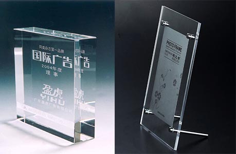 亚克力水晶字很容易被切割和雕刻,有各种各样的形状和大小,亚克力有两种生产工艺:浇铸和压延。激光雕刻主要用浇铸方式生产的有机玻璃,因为它在激光雕刻后产生的霜化效果非常白,与原来透明的质感产生鲜明的对比,压延方式生产的有机玻璃在激光雕刻后依然是透明的,没有一个足够的对比效果。